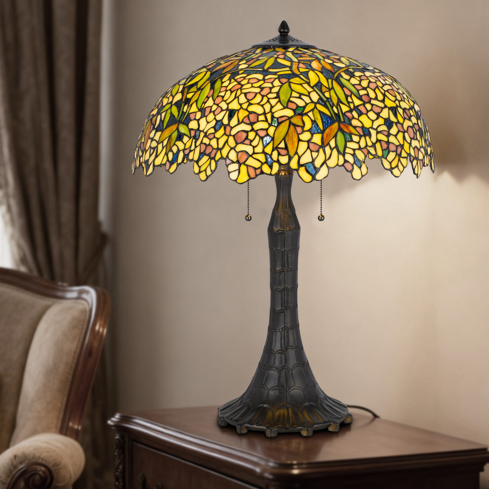 Elevate your home decor with this stunning Tiffany-style table lamp. Its vibrant stained glass shade showcases an exquisite floral motif in golden yellow and lush green hues, casting a warm, inviting glow. A timeless piece of artisanal craftsmanship