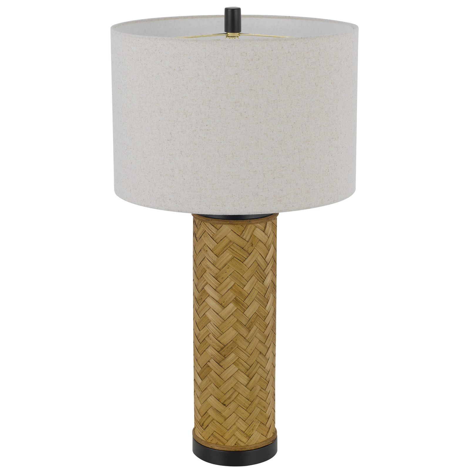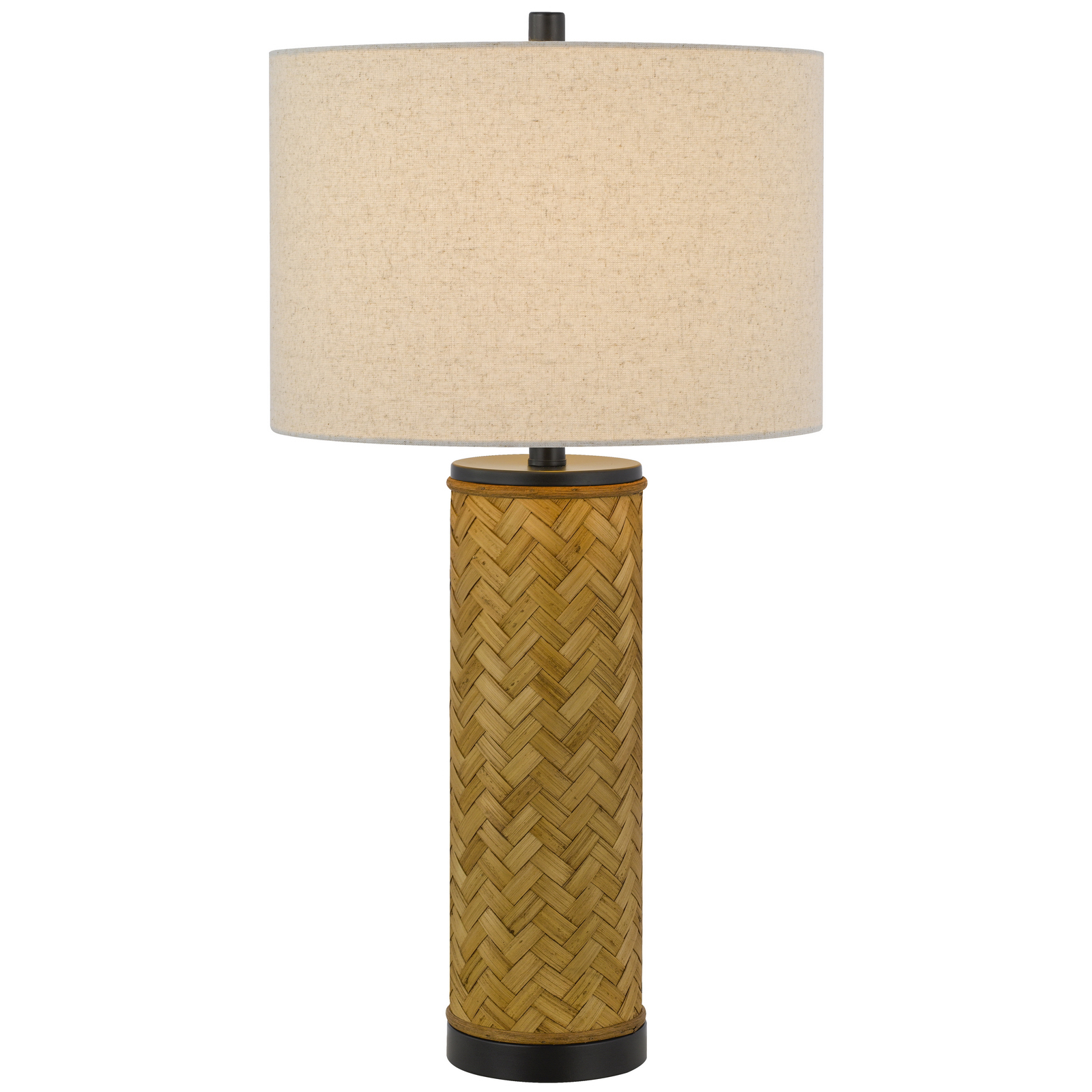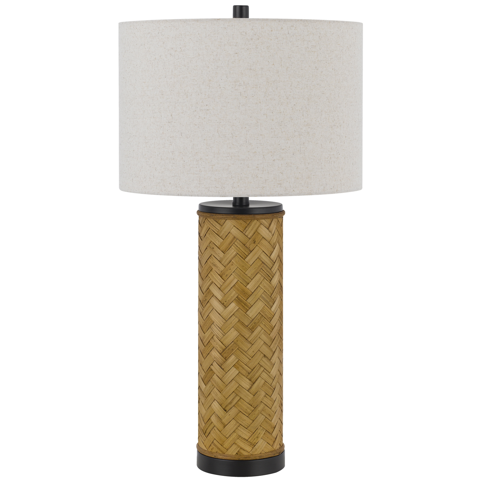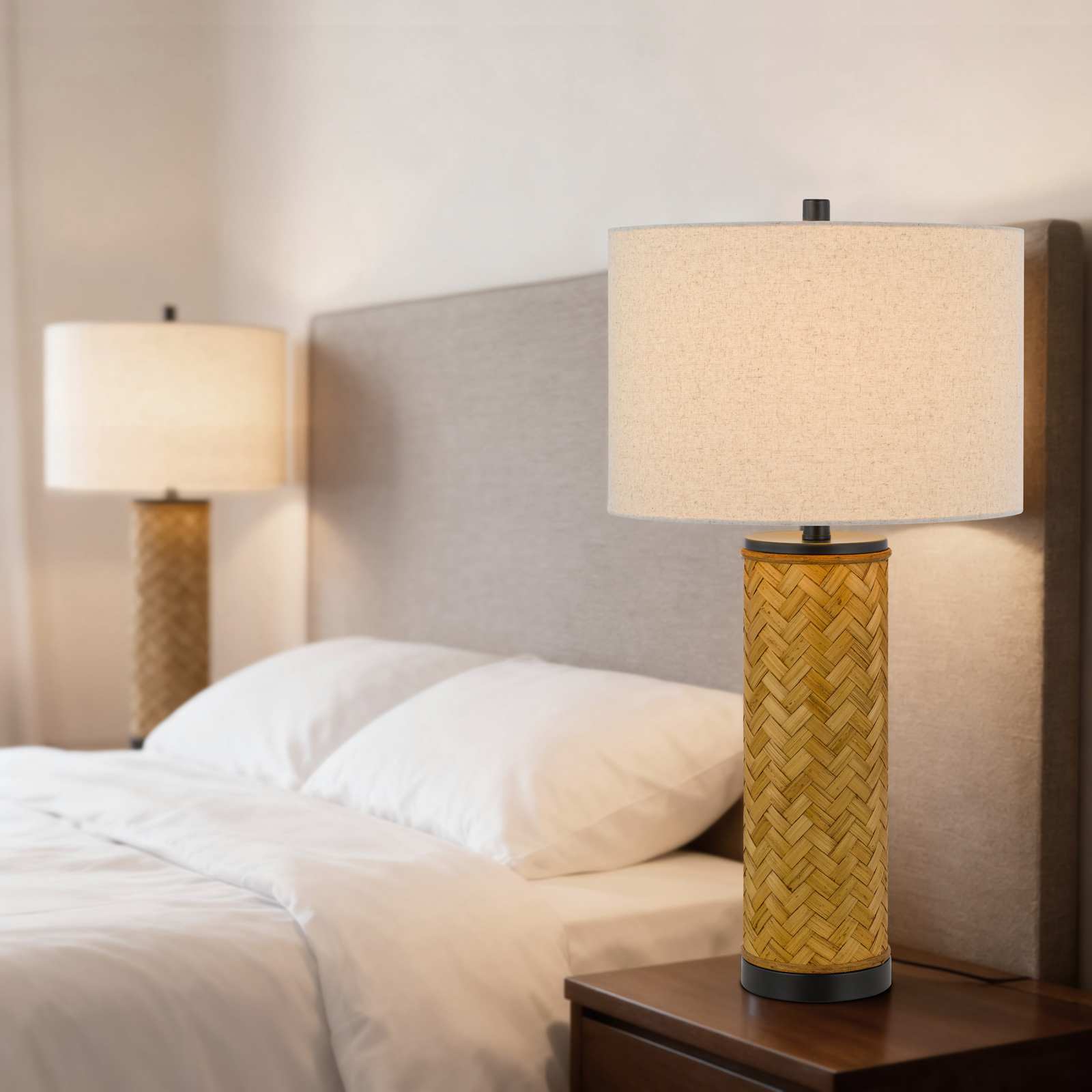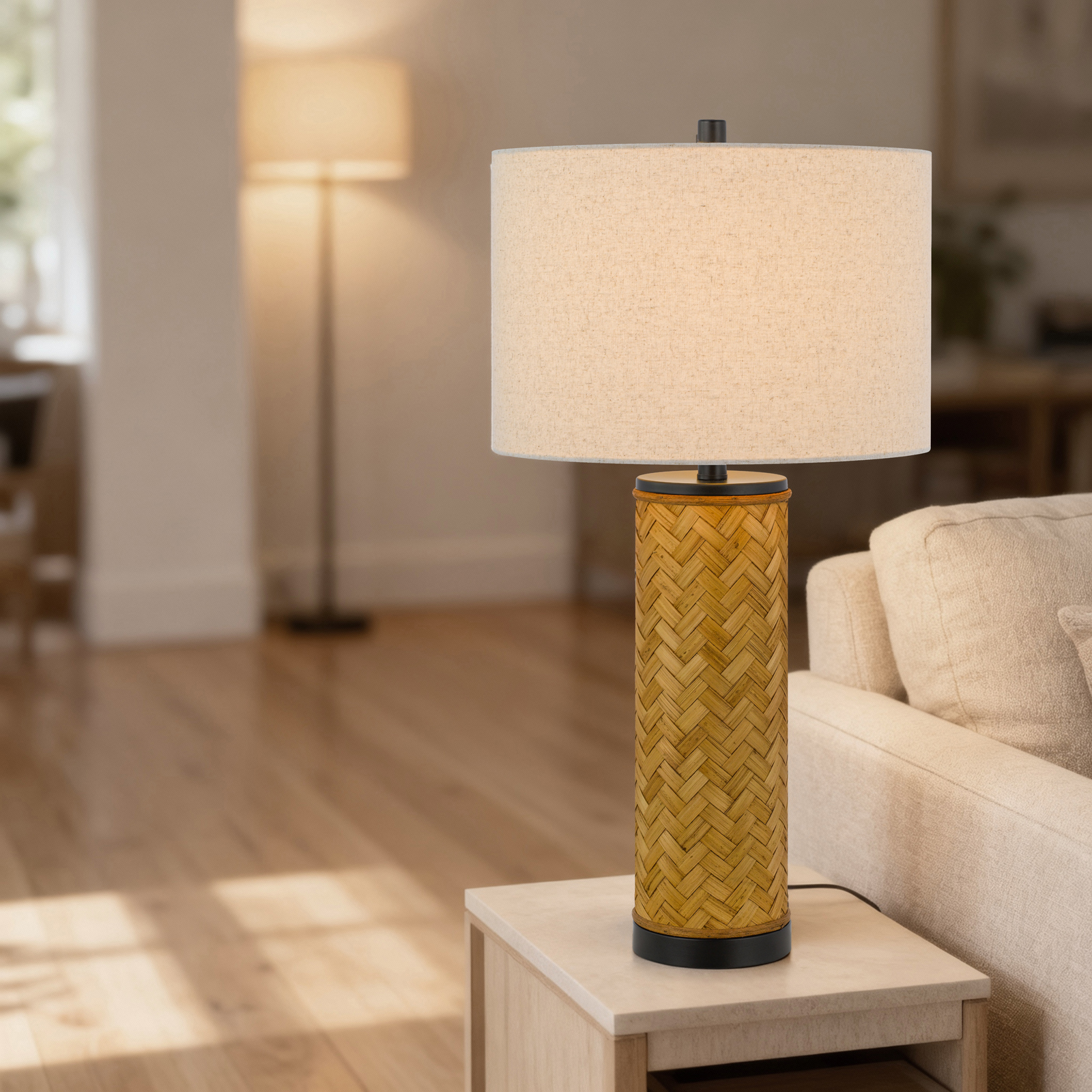 Bring natural texture into your decor. A striking column of woven rattan supports a neutral linen shade, creating a balanced, modern look. This lamp adds an instant, coastal-chic upgrade to any room.