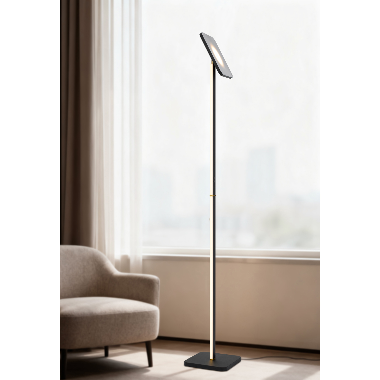 Elevate your space with this elegant LED floor lamp. Its sleek, black-matte finish and brass details combine modern design with brilliant illumination. A perfect, minimalist addition to your sophisticated home.