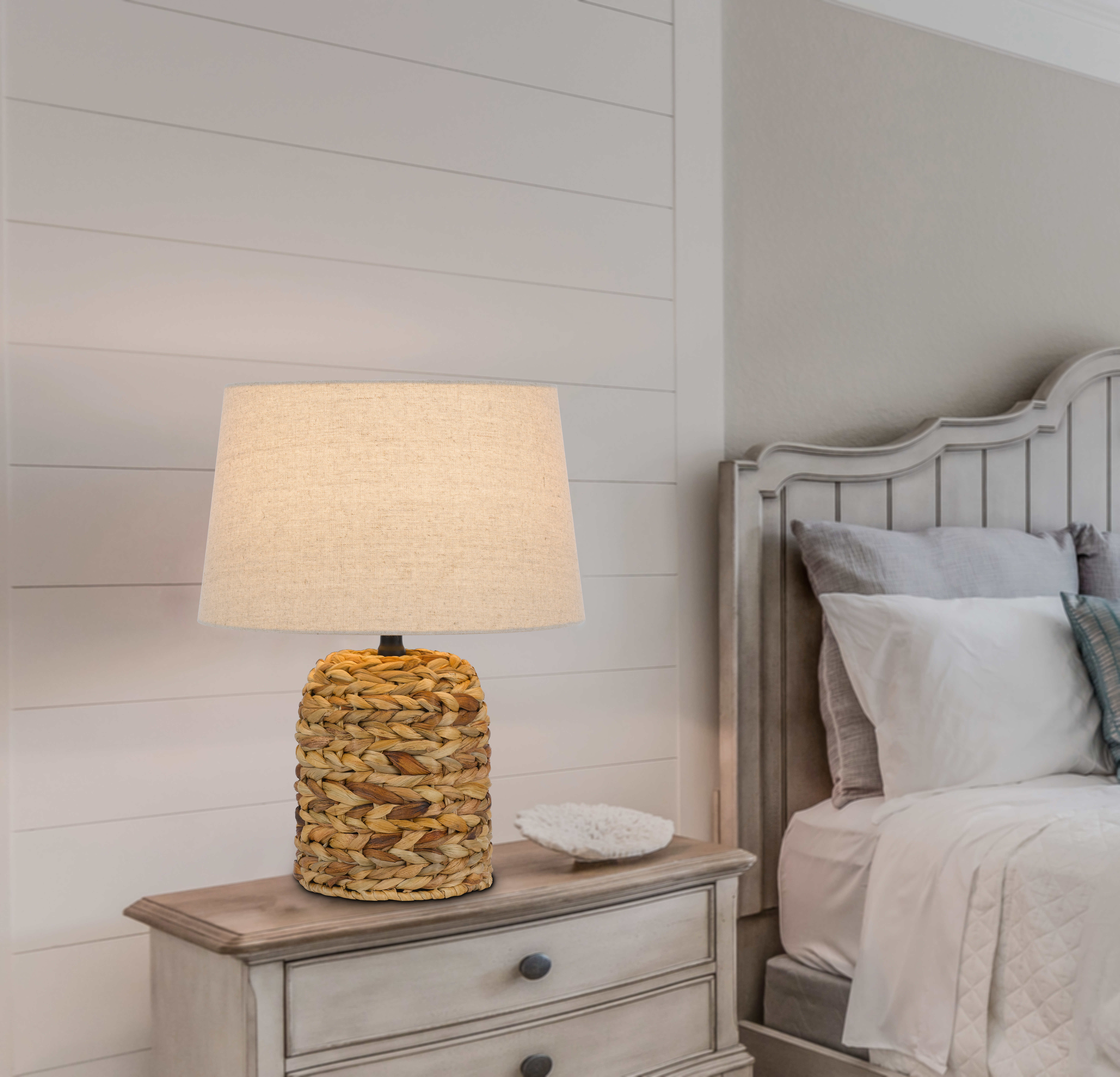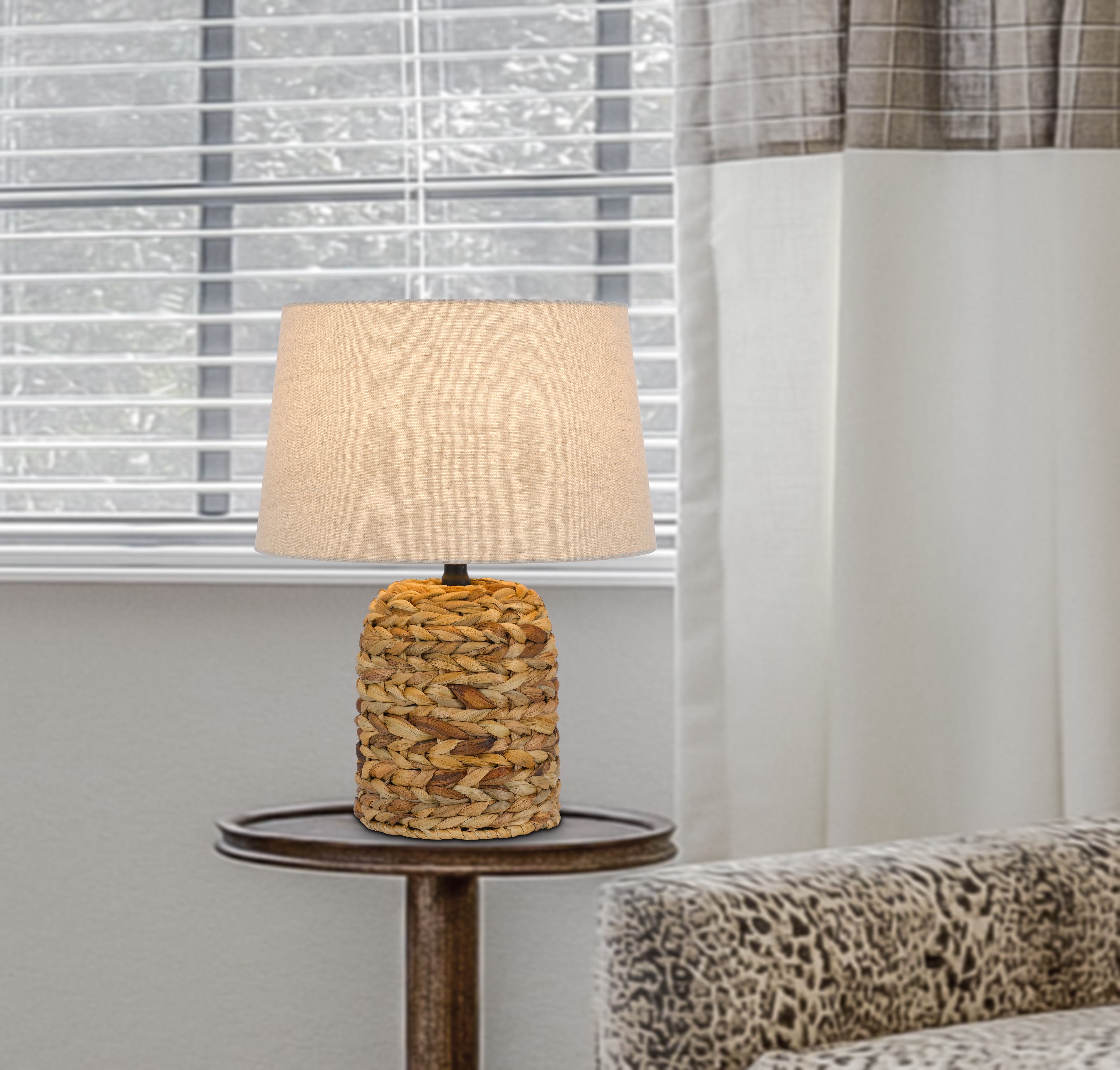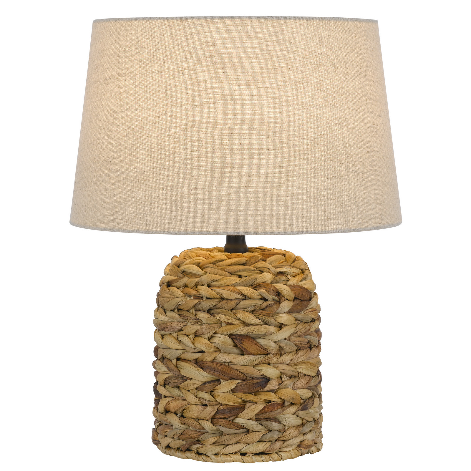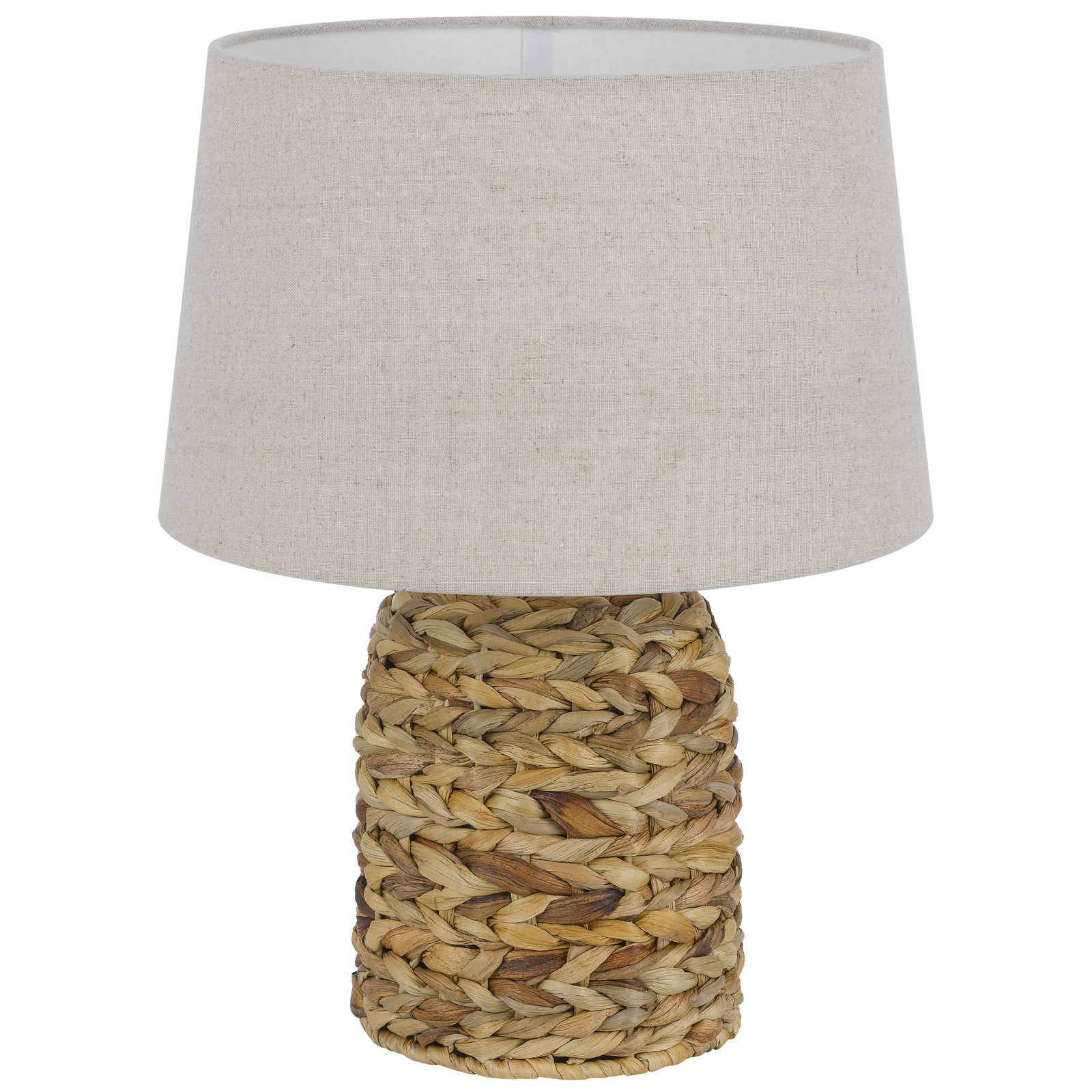 Bring a touch of coastal charm to your home with this beautiful accent lamp.?Its base features natural, handwoven fibers in a warm blend of earthy tones, adding organic texture to any room. Topped with a classic linen shade, it provides a soft, ambie