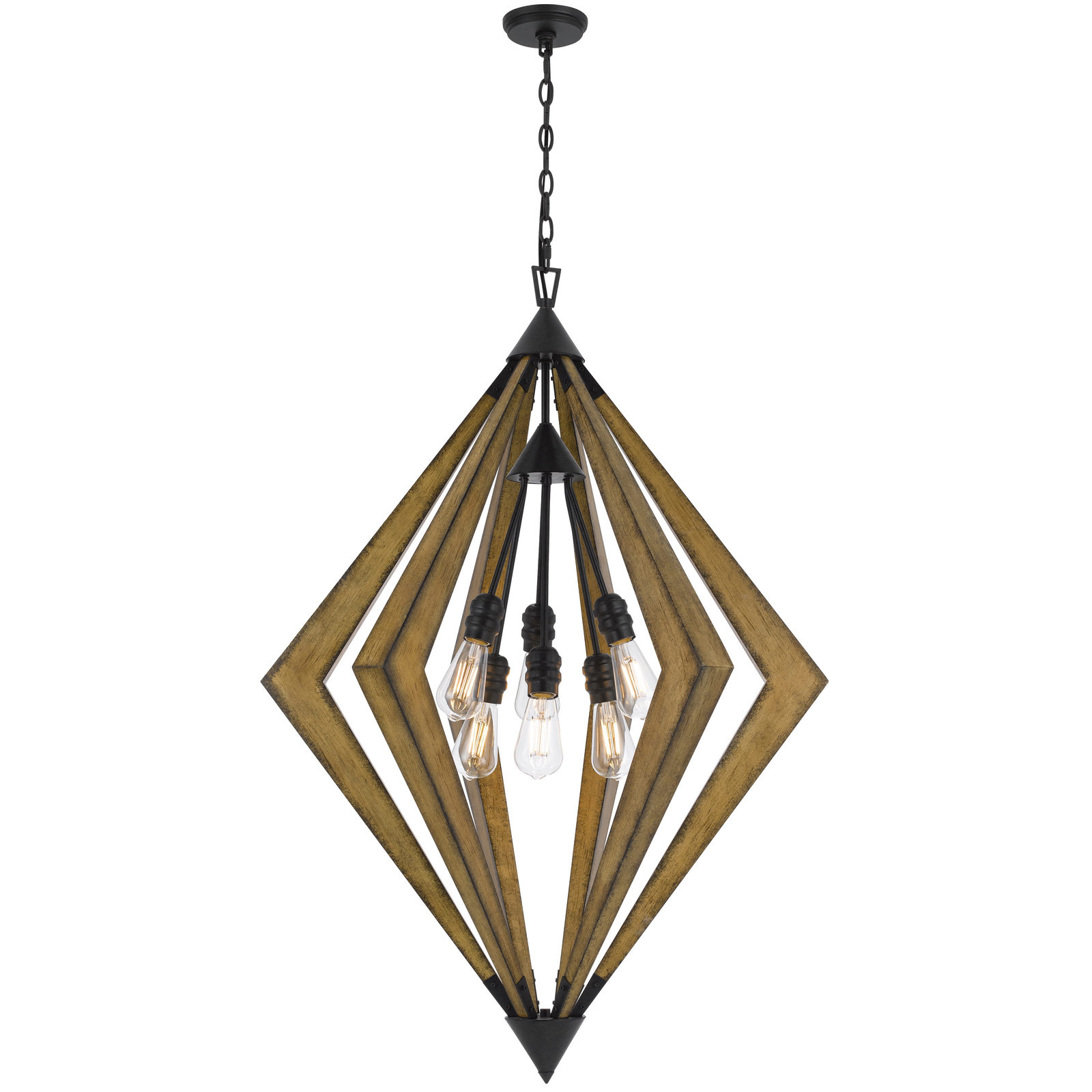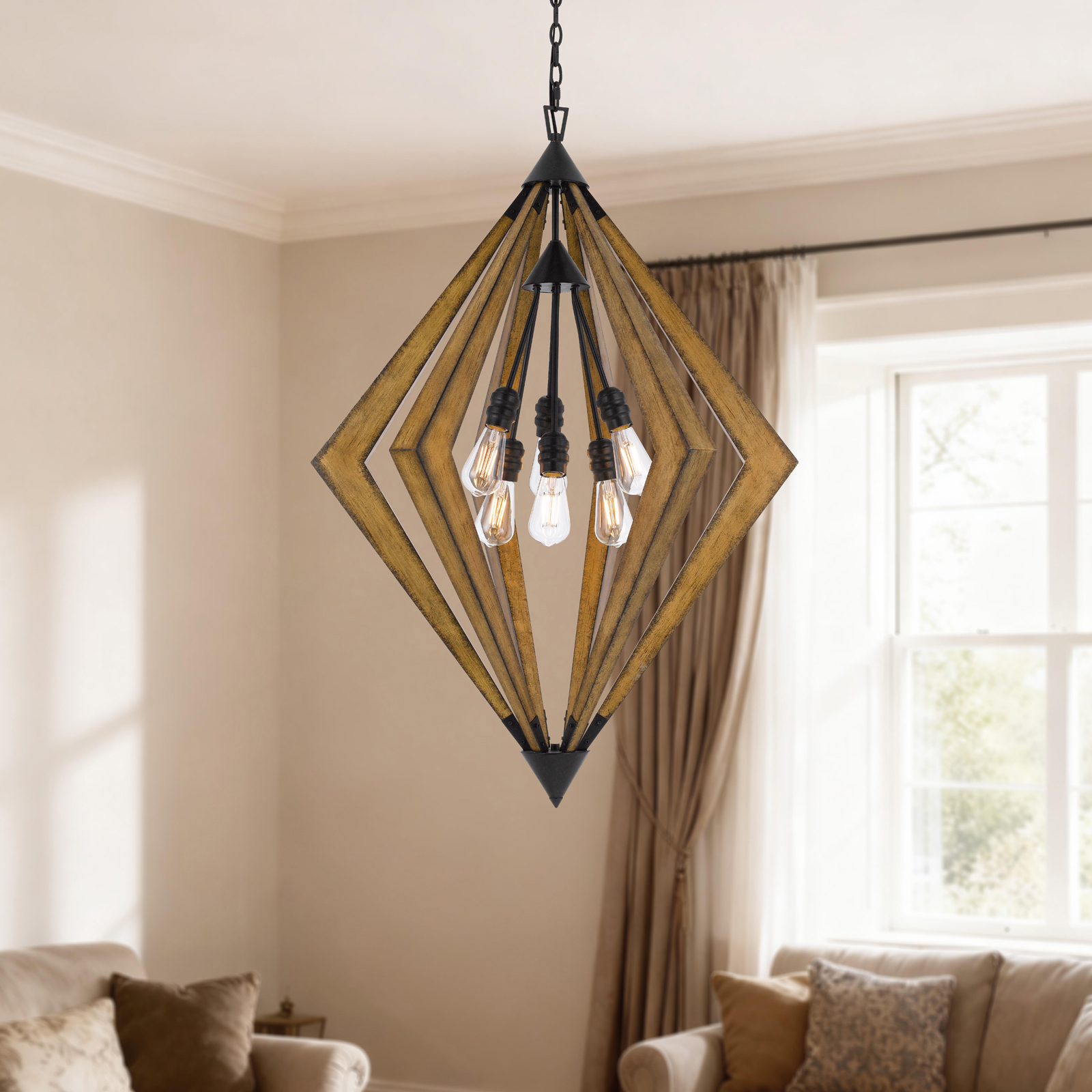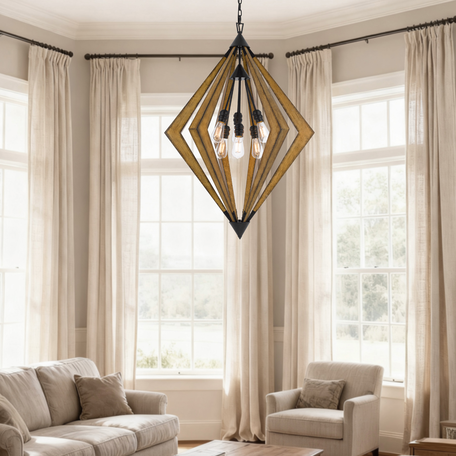 Illuminate your space?with this striking geometric chandelier light. It blends a bold black finish with a warm, distressed wood-look frame for a rustic modern appeal. Perfect for adding unique character and inviting ambient light to any room.